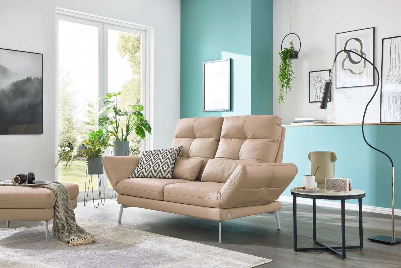 Der 2,5-Sitzer ASSEA GRANDE von MONDO überzeugt durch Eleganz und höchsten Sitzkomfort. Der Bezug aus hochwertigem Leder verleiht ihm eine edle Note. Sie können bei dem Bezug zwischen vier ansprechenden Farben wählen. Mit zwei festen Armlehnen und einem Sitz aus Kaltschaum auf Wellenfedern bietet er ein angenehmes Sitzerlebnis. Die Sitzhöhe von ca. 46 cm sorgt für bequemes Sitzen. Der Metallfuß in Chrom mattem Design unterstreicht das moderne Erscheinungsbild. Der Rücken präsentiert sich im Originalbezug für ein stimmiges Gesamtbild. Auf Wunsch sind individuelle Anpassungen möglich, darunter Rückenneigung, Klapparmlehnen, Drehsitzfunktion, Nierenkissen sowie eine praktische USB-Ladestation. Mit dem 2,5 Sitzer von MONDO erleben Sie nicht nur exklusives Design, sondern auch vielseitige Anpassungsmöglichkeiten für Ihre persönlichen Bedürfnisse. Ein Möbelstück, das nicht nur durch seine Optik überzeugt, sondern auch durch seine funktionellen Eigenschaften Ihr Zuhause bereichert.