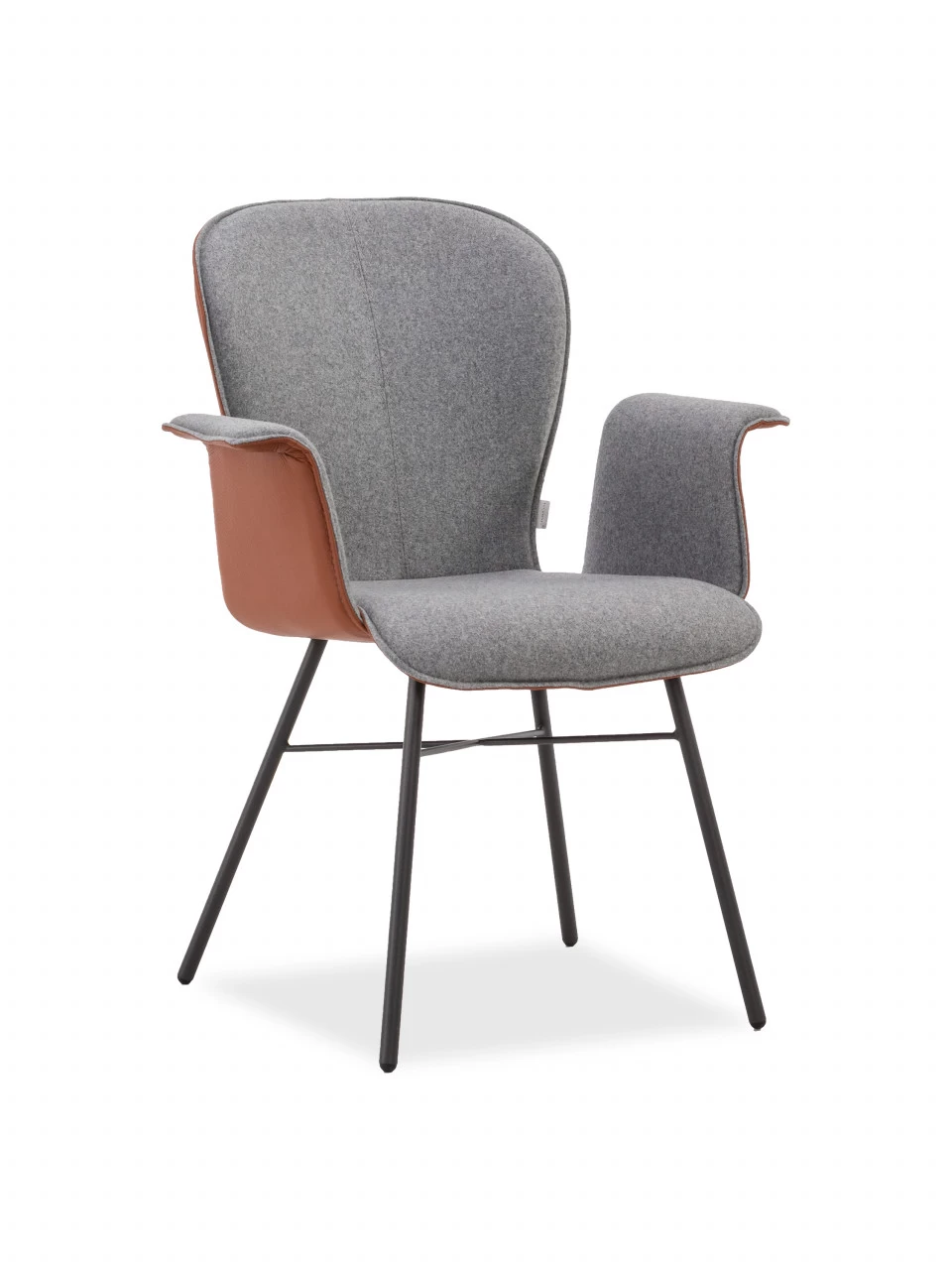 Junger, moderner Sitzkomfort zeichnet den Stuhl Blake Four der Marke bert plantagie aus. Der schicke Stuhl ist mit geschlossenen und gepolsterten Armlehnen ausgestattet, die zusammen mit dem innenliegenden, anschmiegsamen Bezugsstoff in Future Light Grey für viel Bequemlichkeit sorgen. Der äußere, hochwertige Echtlederbezug in Saddle Brown steht im stilvollen Kontrast zum inneren Bezug und zum anthrazit Edelstahl-Rundrohrgestell. Eine angenehme Sitzhöhe von 48 cm und eine Sitztiefe von 43 cm garantieren ein gemütliches Sitzerlebnis in Blake Four.