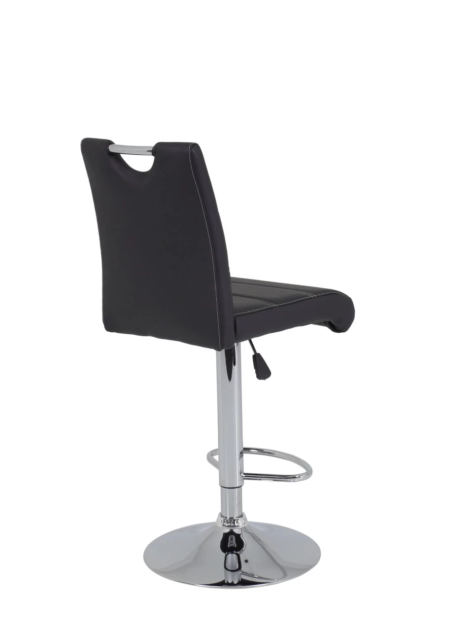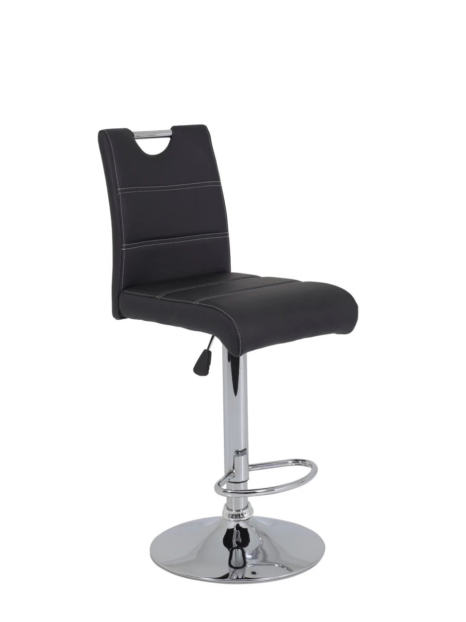 Bezug: Kunstleder 03 schwarz Gestell: Trompete verchromt, mit Gasdruckfeder Sitz und Rücken fest gepolstert mit Steppnähten und Griffloch * Sitzhöhe 60 – 82 cm * Sitztiefe 41 cm * max. Belastbarkeit 120 kg