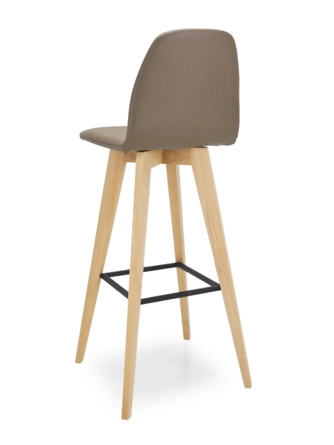 Der Barhocker verfügt über ein Gestell aus geölter Buche natur und einem Bezug in taupe im Lederlook. Für einen interessanten Kontrast sorgt eine Trittleiste aus schwarz lackiertem Metall.