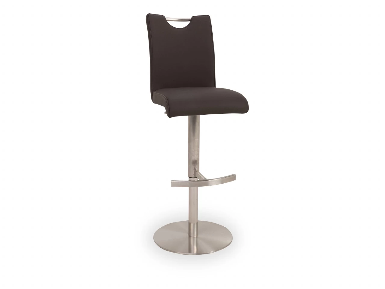 Bezug: Leder braun Gestell: Edelstahl gebürstet mit Griffloch maximale Belastbarkeit bis 120 kg Sitzhöhe einstellbar von 55 – 80cm 360° drehbar Sitzbreite ca. 39cm / Sitztiefe ca. 40cm Standteller 42cm rund, Edelstahl gebürstet, ummantelt Gasdruckfeder 25 cm