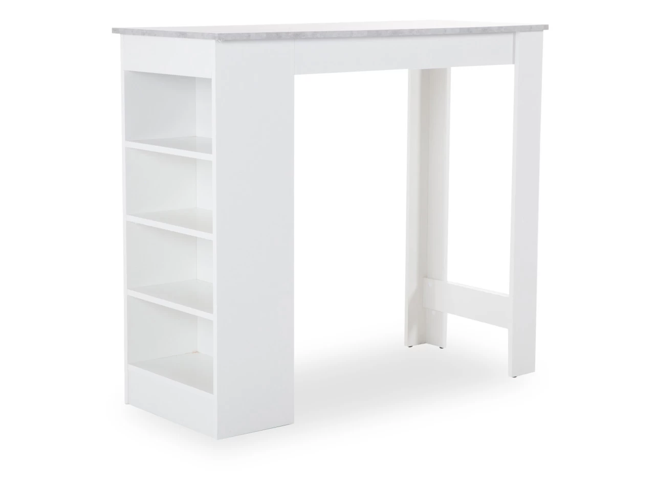 Der Bartisch LEO wird durch sein modernes Design zum Hingucker im Raum! Der Korpus erscheint in weißem Dekor und die Tischplatte besteht aus einer Betonoptik-Nachbildung. Somit wirkt die Bar sehr schick. Praktischerweise verfügt das Möbelstück über ein seitliches Regal mit drei Einlegeböden, sodass Sie diverse Utensilien wie Gläser, Flaschen etc. ganz angenehm verstauen können. Verwöhnen Sie Ihre Gäste zuhause mit leckeren Getränken an Ihrer Bar!