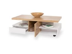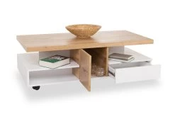 Der Alleskönner der Couchtische- Couchtisch Rennes von MCA. Mit seinen vielen Fächern und Abstellfächern überzeugt der Couchtisch Rennes mit einer atemberaubenden Flexibilität, die durch die Rollen unter dem Tisch weiter gefördert wird. Die Tischplatte sowie der Mittelblock als auch das Unterteil sind aus MDF Eichenholz. Der Unterteil wurde in matt weiß lackiert um in Ihrem Wohnraum als ein kleines Highlight zu dienen. Der Couchtisch ist mit zwei Schubkästen ausgestattet.