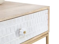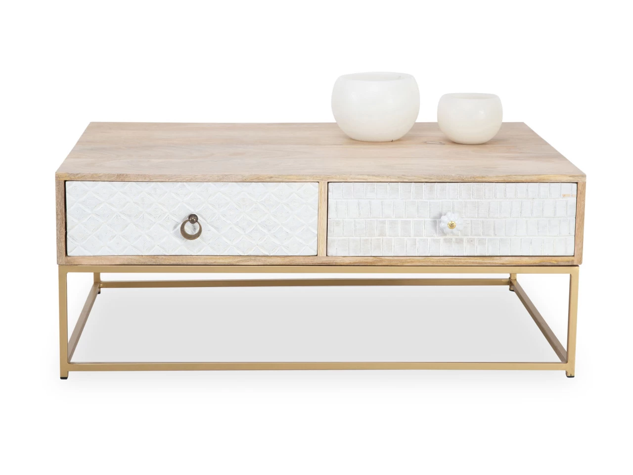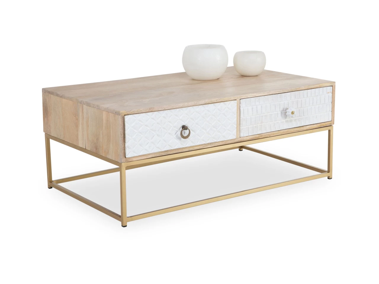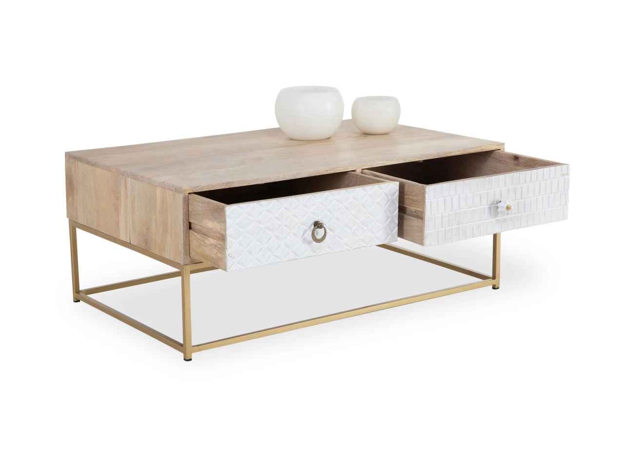 Mit dem modernen Couchtisch AMRUM von SANSIBAR sorgen Sie für einen echten Blickfang in Ihrem Zuhause. Der Korpus aus robustem Mango-Holz in Beige verleiht Ihrem Wohnzimmer eine warme und einladende Atmosphäre. Das elegante Metallgestell in Goldfarben setzt stilvolle Akzente. Mit zwei geräumigen Schubladen bietet der Tisch praktischen Stauraum und Ordnung für Ihre Wohnaccessoires. Bereichern Sie Ihren Wohnraum mit dem Couchtisch AMRUM von der Marke SANSIBAR.