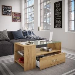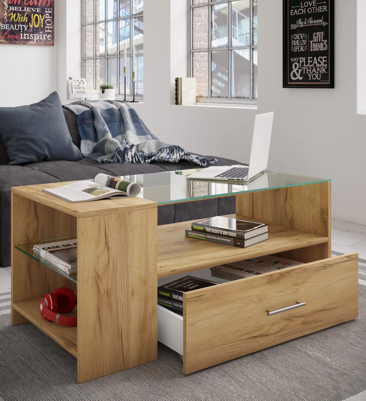 · Zwei seitliche offene Fächer, die offene Ablagefläche unterhalb der Tischplatte und die leichtgängige Schublade bieten ausreichend Stauraum für die perfekte Ordnung.