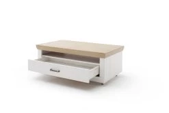 Mit dem Couchtisch Calva aus dem Hause vito vollenden Sie gekonnt Ihren Wohnbereich. Das moderne Design ist ein absoluter Hingucker und wird Familie und Freunde staunen lassen. Die Front ist aus Pinie Aurelio Dekor, während die Tischplatte aus Grandson Oak Dekor und ebenfalls Pinie Aurelio gefertigt ist. Die Griffe aus Metall runden das Design perfekt ab. Der Couchtisch kommt mit einem gedämpften Schubkasten und einem Fach, sowie vier Rollen. So lässt er sich bequem im Raum positionieren.