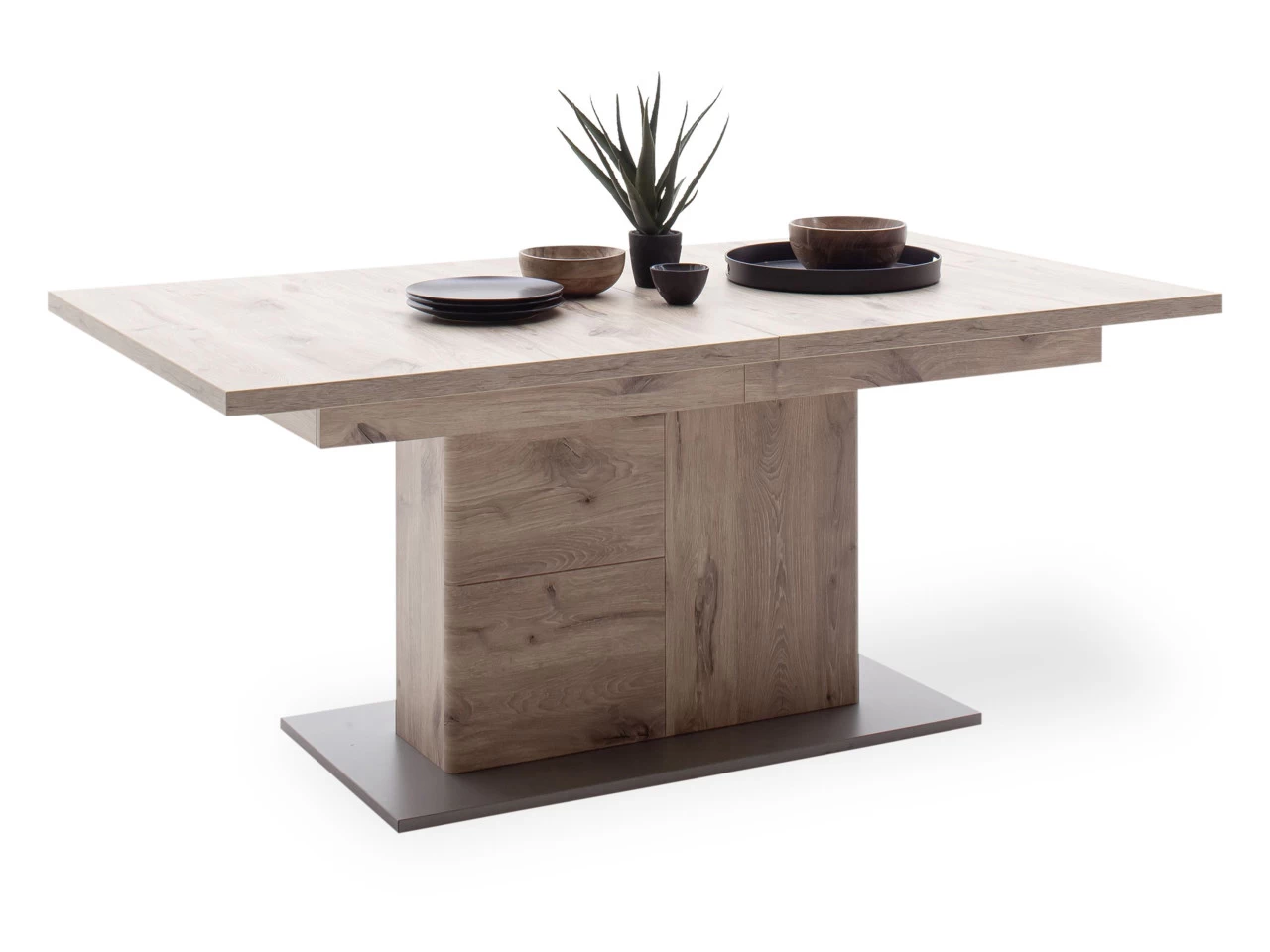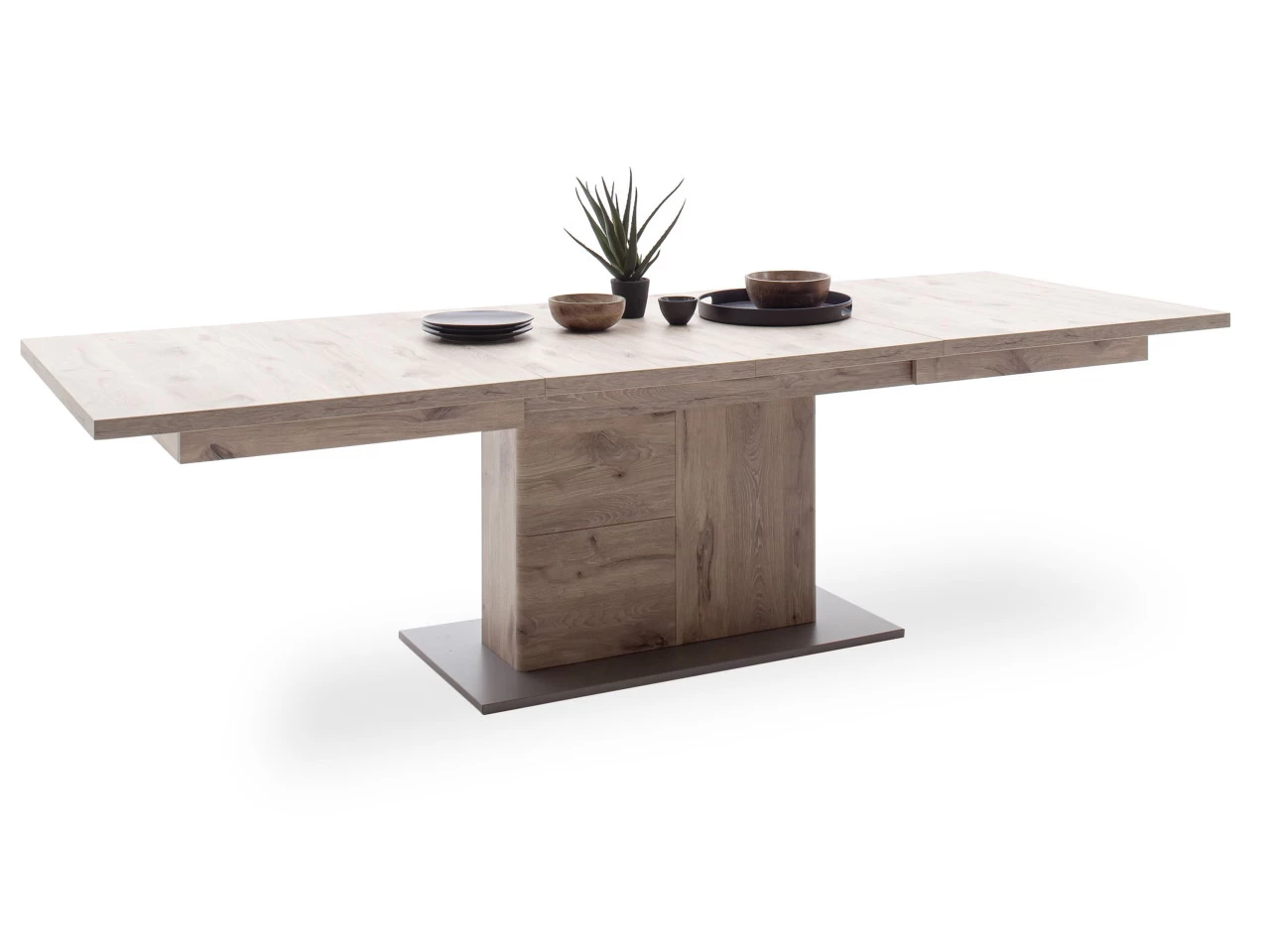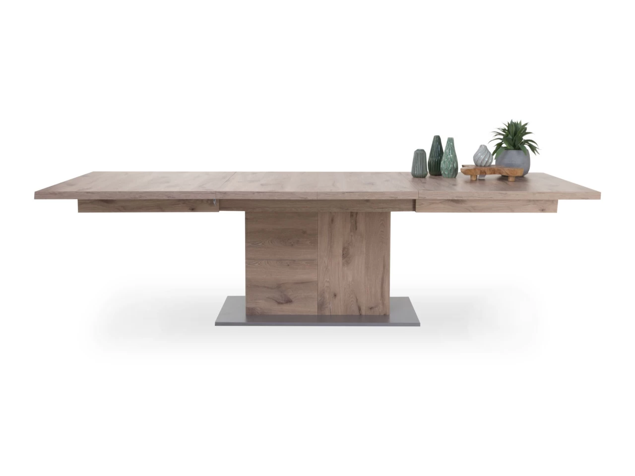 Genießen Sie gemeinsame Mahlzeiten am modernen Esstisch MARSEILLE der Trendmarke HARPER. Der Tisch erscheint in robustem Dekor in der angesagten Ausführung Viking Oak. Dank zwei innenliegende, 50 cm lange Einlegeplatten, lässt sich der Tisch mit einem Synchronauszug mühelos auf großzügige 280 x 100 cm ausziehen. Die silbergraue Bodenplatte verleiht dem Tisch einen sicheren Stand und harmoniert wunderschön mit dem kühlen Braunton der Tischplatte.