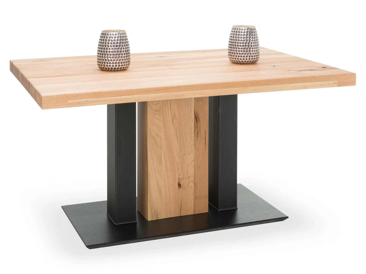 Der edle Tisch besteht aus massive Balkeneiche mit wachseffekt Lackierung. Eine Bodenplatte aus MDF in ummantelt schwarzer Balkeneiche verleiht dem Tisch Stabilität. Der Tisch mit Risse und Spalten in der Oberfläche sind gewollt und Verleihen so jedem Tisch seinen einzigartigen Charakter.