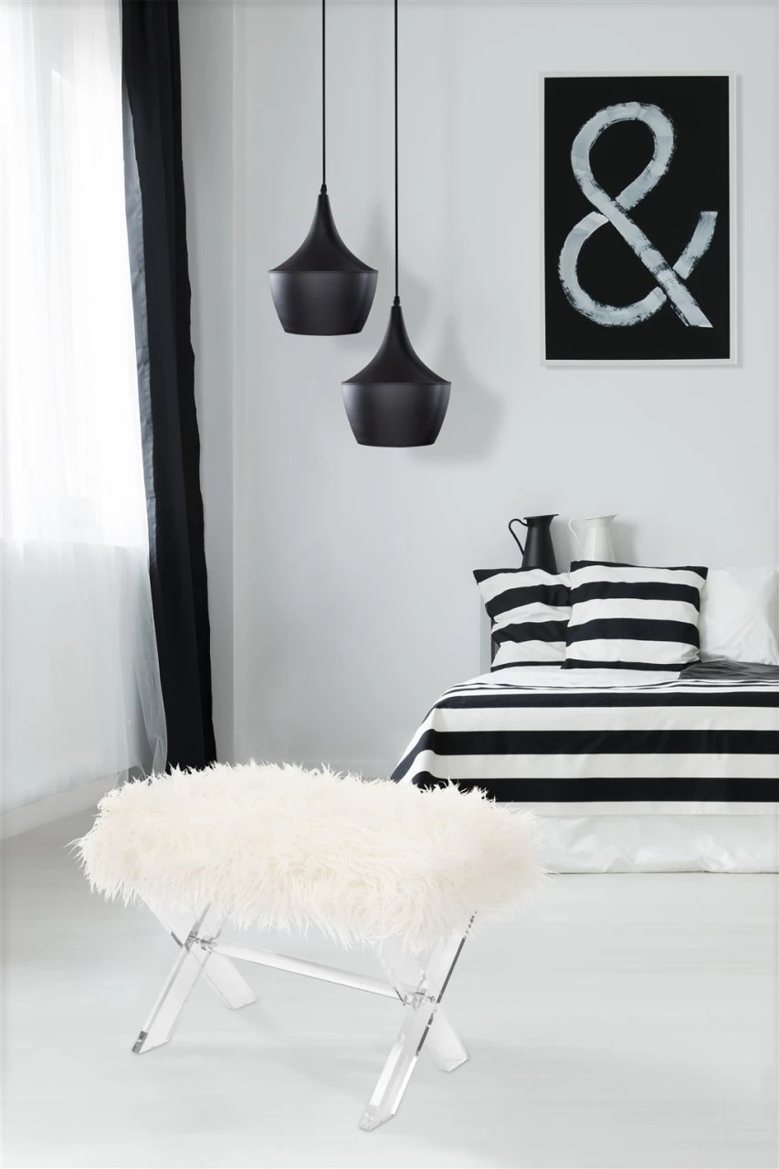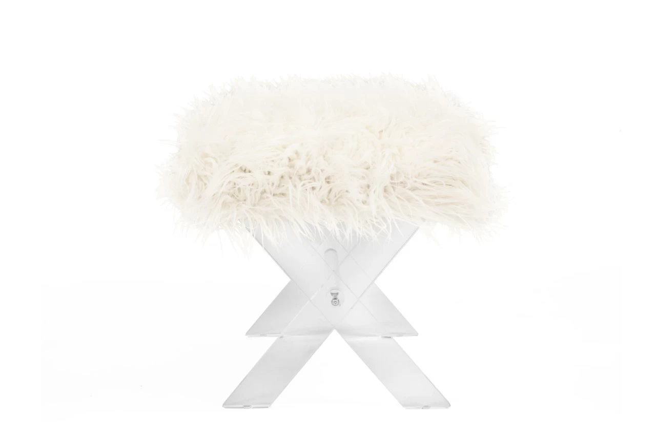 · Mit diesem trendigen Hocker holen Sie sich einen Blickfang nach Hause. Das transparente Acrylgestell schließt mit einer Spanplatte als Sitzfläche ab, die mit Schaumstoff und weißem Kunstfell bezogen ist. Mit einer Tragkraft von bis zu 100 KG ist der Fellhocker eine ansehnliche und bequeme Alternative zu einem herkömmlichen Stuhl. Durch das gekreuzte und mit einer Querstrebe versehene Gestell wird die längliche Form des Hockers gestützt. Um Bequemlichkeit zu erhalten, können Sie bei diesem Hockermodell ganz auf ein zusätzliches Sitzkissen verzichten, denn die Sitzfläche selbst bietet bereits hohen Komfort. Platzieren Sie Ihre neue Sitzgelegenheit auf einem kuscheligen Hochflorteppich und Sie erhalten dank der weichen Materialien ein gemütliches Raumklima.