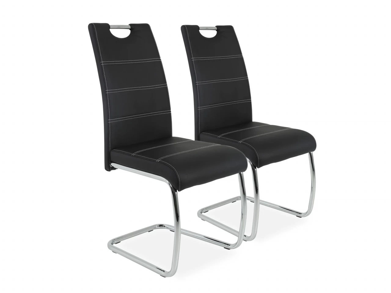 Schaffen Sie mit dem Freischwinger FLORA S 2er Set der Marke HELA stilvolle Sitzgelegenheiten. Die Rückenlehne und die Sitzfläche der beiden Schwingstühle sind mit schwarzem Kunstleder bezogen (97% Polyurethan, 3% Baumwolle). Das verchromte Rundrohr Metallgestell schafft einen edlen Kontrast zum Kunstleder und sorgt für einen sicheren Stand. Helle, sichtbare Doppelnähte verzieren Sitz und Rücken dezent. Die Freischwinger sind bis zu 120 kg belastbar.