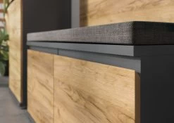 Mit einem schicken Design erscheint die Schuhbank Gent aus dem Hause HARPER. Die elegante Bank hält genügend Stauraum für acht Paar Schuhe bereit und ist dabei ein echtes Highlight in Ihrer Garderobe. Die Front ist aus Navarra Eiche Nachbildung gefertigt und wird von Applikationen in anthrazit kontrastiert. Das grifflose Design verleiht der Schuhbank ein modernes Design. Hinter zwei gedämpften Türen befindet sich ein verstellbarer Einlegeboden, der genügend Platz bereithält. Für einen sicheren Stand sorgen die eckigen Kunststofffüße.