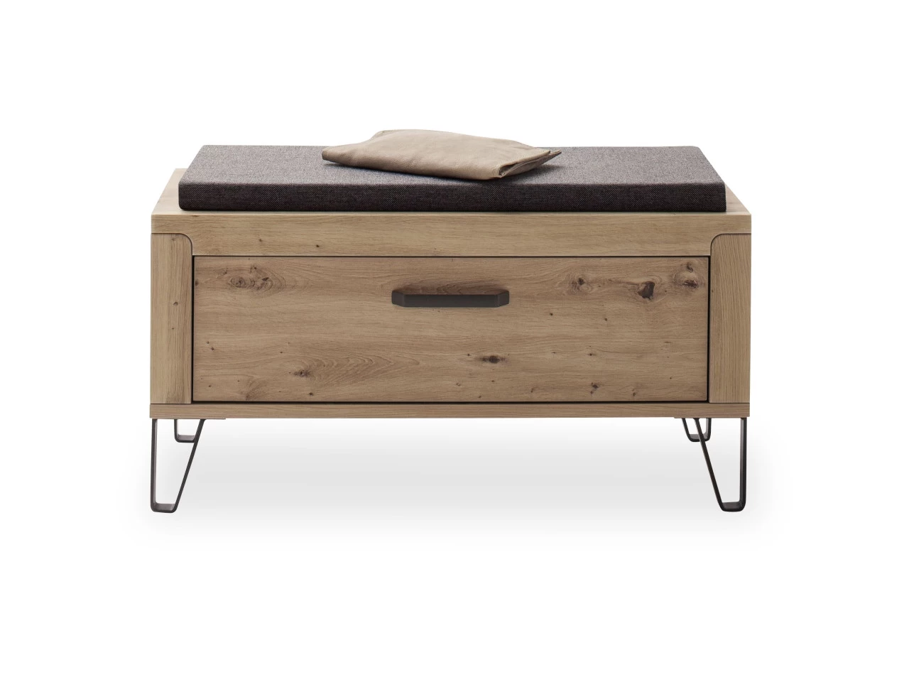 Die Garderobenbank Incata von vito erscheint in einem klar konzipierten, modernen Design. Das Element besteht dabei aus Balkeneiche Melamin Nachbildung mit Absetzungen in Oxid Melamin Nachbildung und wird von einem dezenten Gestell abgerundet. Hinter einer Klappe bietet die Bank Platz zum Verstauen von Schuhen. So bleibt der Eingangsbereich ordentlich und Sie erhalten eine praktische Sitzgelegenheit zum Anziehen der Schuhe.