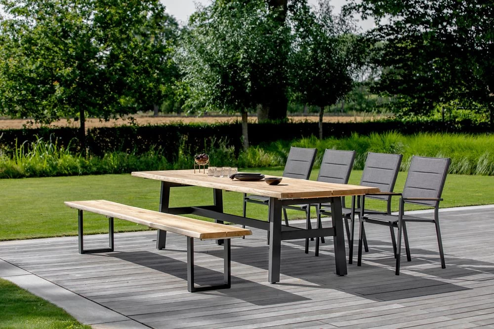 · Bank TAVO Sitzfläche Teak gebürstet mit Baumkante, Gestell Aluminium pulverbeschichtet, Farbton anthrazit, B 240 T 45 H 46 cm