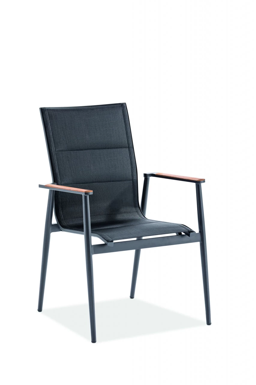 · Hochlehner REGG Sitz und Rücken in Textilen schwarz, Armlehnauflagen Teak natur, Gestell Aluminium pulverbeschichtet, Farbton anthrazit, 61×67 / 96 cm