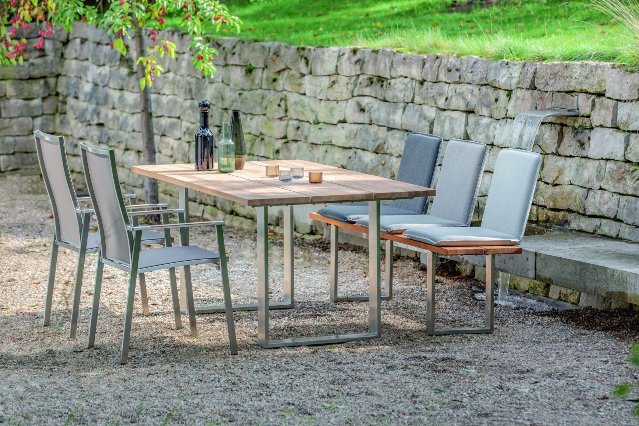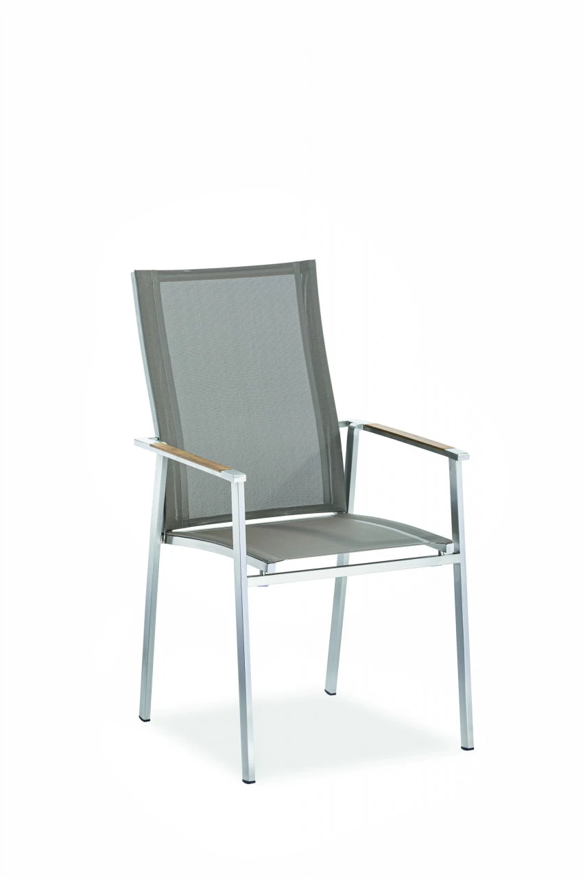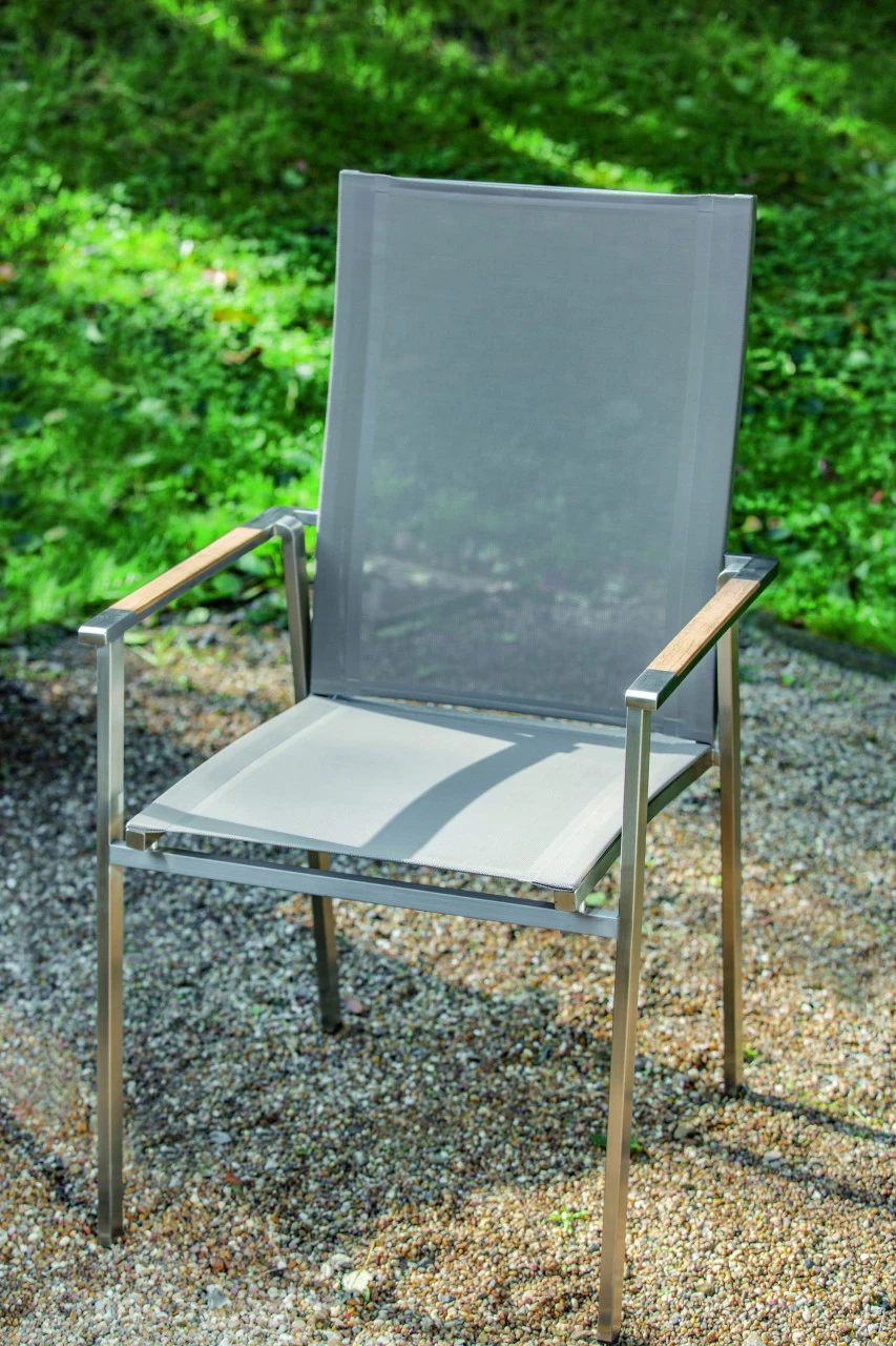 · Hochlehner SCALEA Sitz und Rücken in Textilen, Armlehnauflagen Teak natur, Gestell Edelstahl gebürstet, stapelbar, 57×64 / 100 cm
