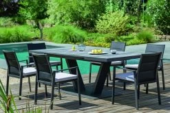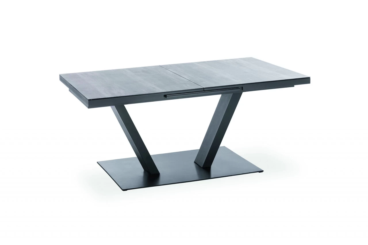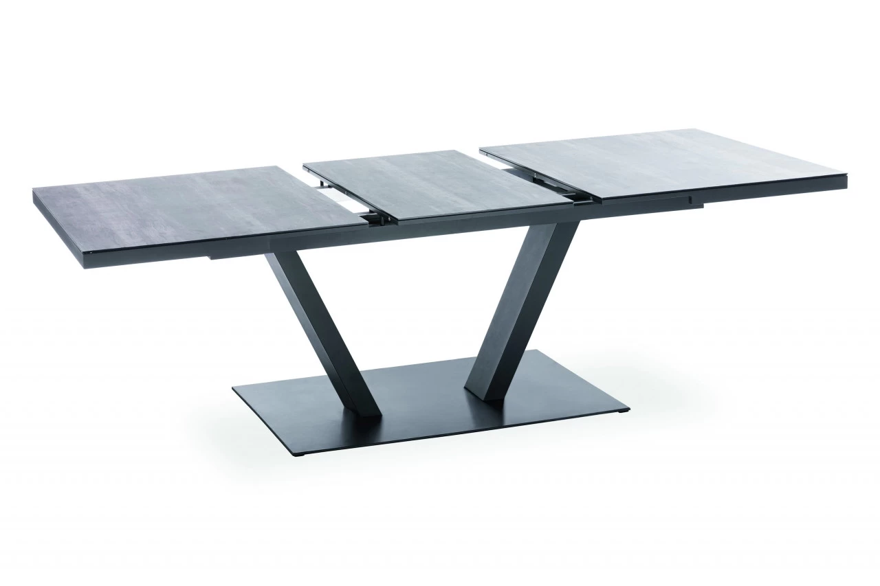 · Ausziehtisch Tischplatte mit Glasauflage mit Keramikbeschichtung in Holzoptik grau mit 2(3) Segmenten, Synchronauszug 60 cm, Gestell Aluminium pulverbeschichtet, Farbton anthrazit, 180(240)x100 / 76 cm