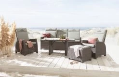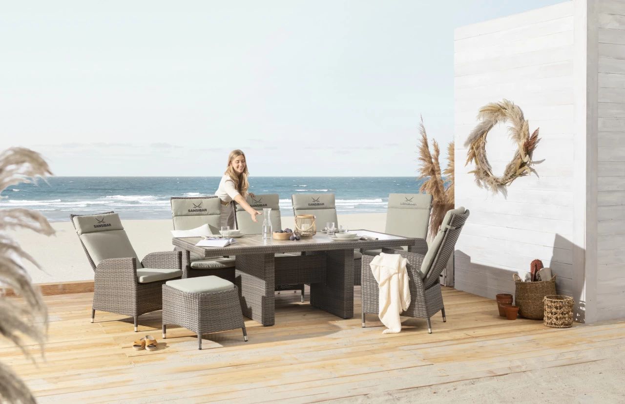 Der Lounge-Tisch List von unserer Hausmarke SANSIBAR LIVING stellt den idealen Begleiter für Ihre Gartenlounge dar. Die hochwertige Keramikplatte in Holzoptik bietet viel Platz für Essen, Getränke oder Dekoration. Die freundliche Optik in braun zeigt sich modern sowie zeitlos. Das Gestell wird aus einer Kombination aus Aluminium und doppelt halbrunden Streifen aus Polyrattan gefertigt.