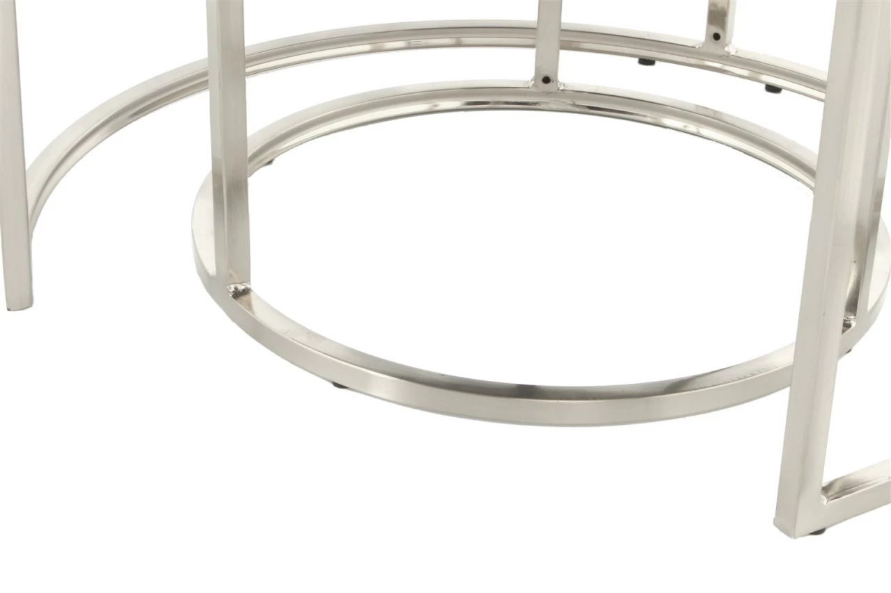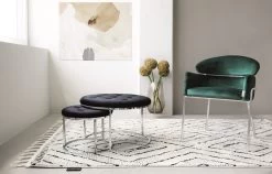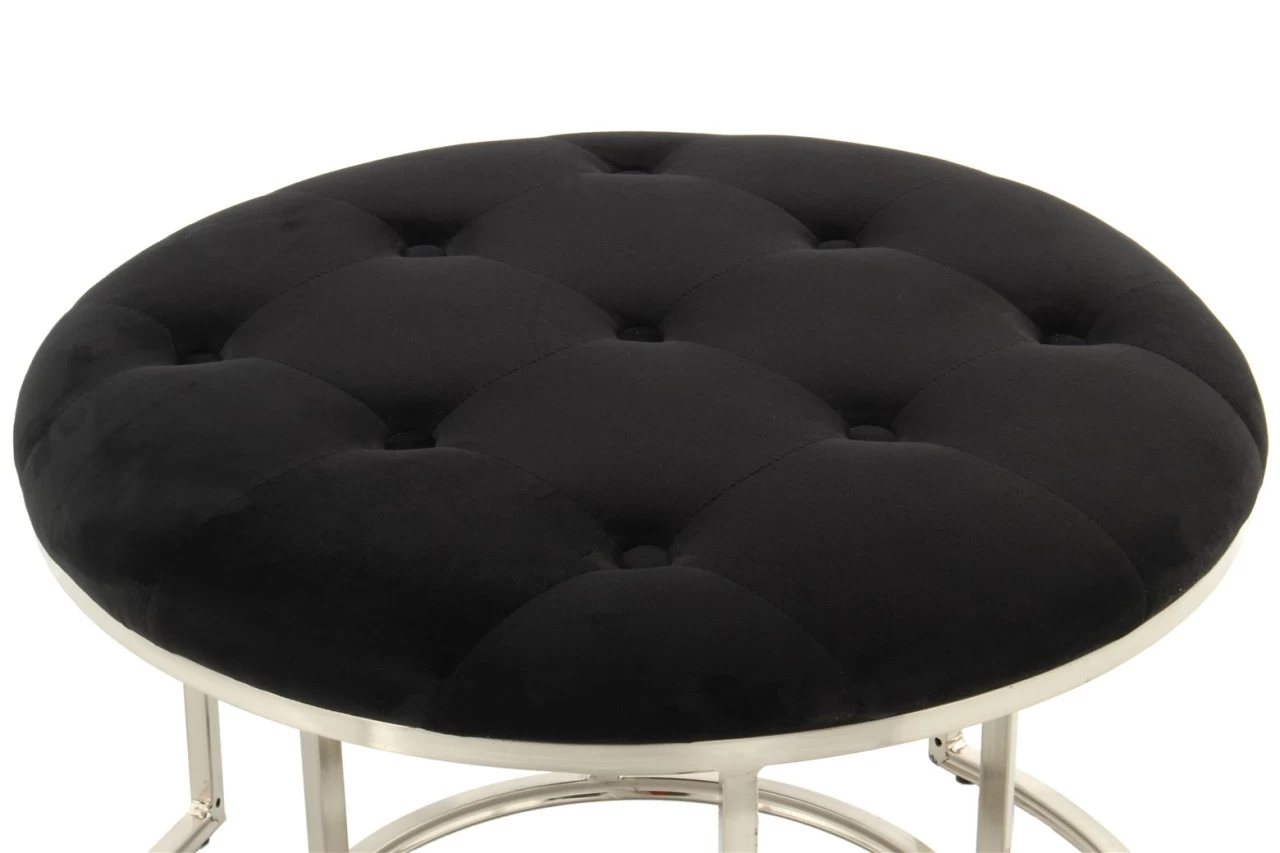 · Dieser wunderschöne runden Hocker im 2er-Set besitzen einen samtigen Stoffbezug aus Polyester. Diese Hocker sind zum gemütlichen Verweilen geeignet. Außerdem sind die Hocker ineinander stapelbar, wodurch bei Bedarf Platz gespart werden kann. Der farbliche Akzent des Edelstahls verleiht den Hockern einen edlen Touch. Die neutralen, unaufdringlichen Farben des mit Zierknöpfen versehenen Polsters sorgen auf eine stilvolle Weise dafür, dass sich dieses dekorative Möbel in jede Wohnlandschaft integrieren lässt. Spezifikationen: ? Farben: Elfenbein / Gold, Grau / Silber, Schwarz / Silber, Taupe / Gold ? Material: 100% Polyester, Schaumstoff, 100 % Eisen, Sperrholz ? Größe: ca. 40cm / 60cm (L/T) x 40cm / 60cm (B) x 32cm / 41cm (H)