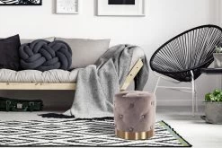 · Richten Sie Ihr Zuhause mit diesem Hocker gemütlich ein. Der samtweiche Stoffbezug in einfarbigem Design wird durch die Steppnähte und die Zierknöpfe zu einem ganz besonderen Hingucker, der Charme und Eleganz ausstrahlt. Abgerundet wird das Design durch den goldenen Standfuß, der einen glamourösen Akzent setzt. Egal ob im Wohnzimmer, im Eingangsbereich oder im Schlafzimmer ? mit diesem Hocker können Sie jeden Raum aufpeppen. Komfort bringt der Hocker dank des samtigen Bezugs und der weich gepolsterten Sitzfläche mit sich. Als zusätzliche Sitzgelegenheit für Ihre Gäste ist der Hocker daher ideal geeignet, denn er ist bequem und gleichzeitig dekorativ. Bei Bedarf können Sie das Möbelstück einfach zur platzsparend an die Seite stellen. Das Möbelstück kann in seiner tatsächlichen Farbgebung von den Bildern abweichen. Durch unterschiedlichen Lichteinfall und verschiedene Streichrichtungen des Stoffbezuges können unterschiedliche Farbnuancen entstehen.