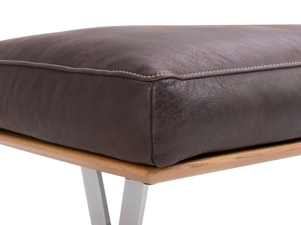 Die Hockerbank Dsign Fatilo aus dem Hause KOINOR wird Ihren Wohnbereich um eine schicke Sitzmöglichkeit ergänzen. Der Hocker ist mit einem Echtlederbezug in der Farbe India Schoko bezogen, passend dazu ist eine Kontrastnaht in beige gewählt. Der Massivholzrahmen aus geölter Wildeiche sorgt für einen echten Hingucker. Die Metallkufen sind aus satiniertem Nickel. Für ein angenehmes Sitzgefühl sorgt die besonders legere Polsterung. Auf Wunsch sind Kissen erhältlich.