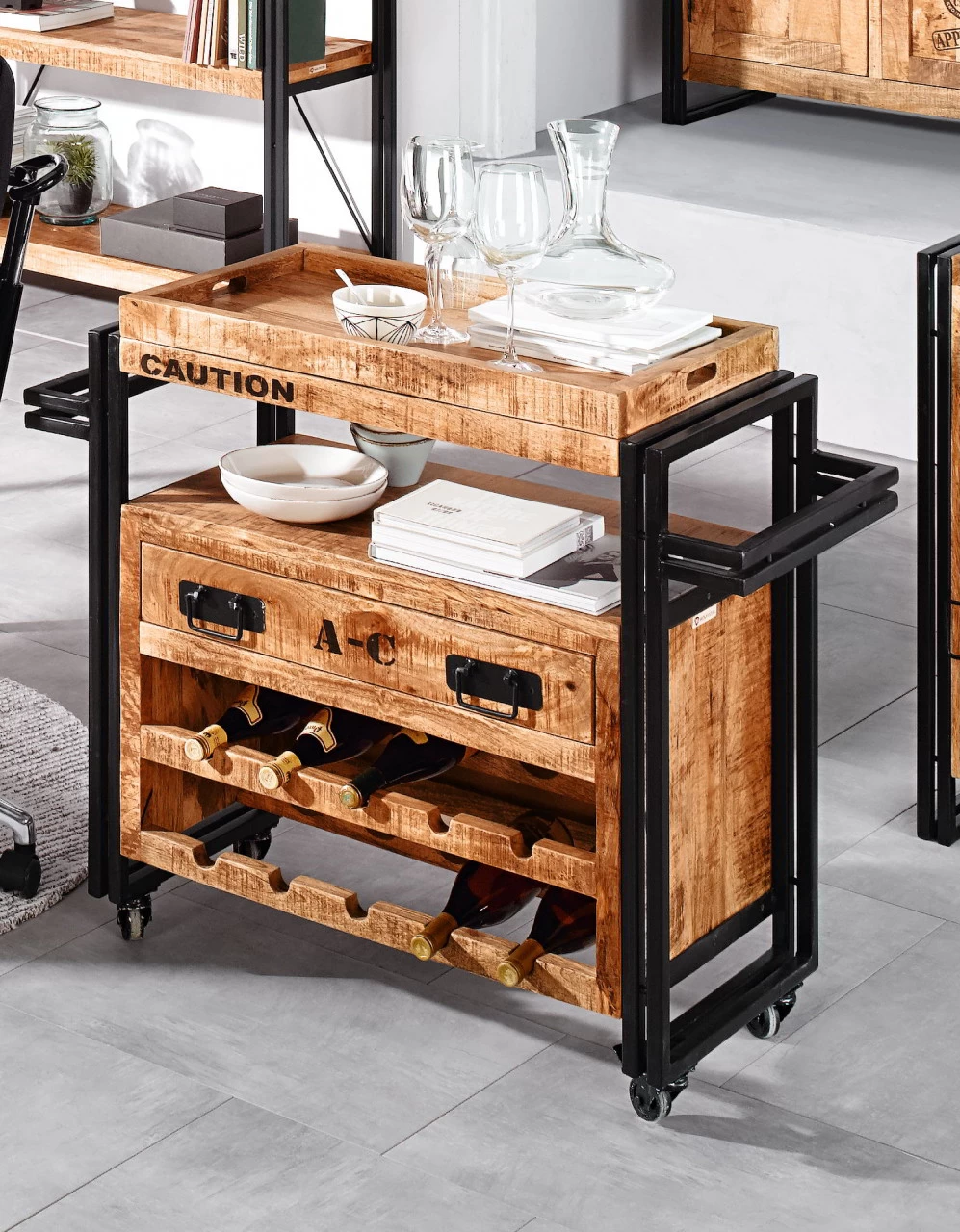 Der Küchenwagen Iron von WOLFMÖBEL sorgt für natürlich-schöne Akzente in Ihrem Wohnbereich. Der praktische Wagen bietet viele Verstaumöglichkeiten für Flaschen, Teller und diverse weitere Utensilien. Der Wagen aus hochwertigem Mangoholz und Eisenstangen wird zu einem schicken Hingucker. Dank der vielen Staumöglichkeiten können Sie Speisen und Getränke bequem transportieren. Durch die vier leichtgängigen Rollen ist der Servierwagen flexibel einsetzbar. Der Küchenwagen verfügt zudem über eine abnehmbare Ablage, die als Tablett eingesetzt werden kann.