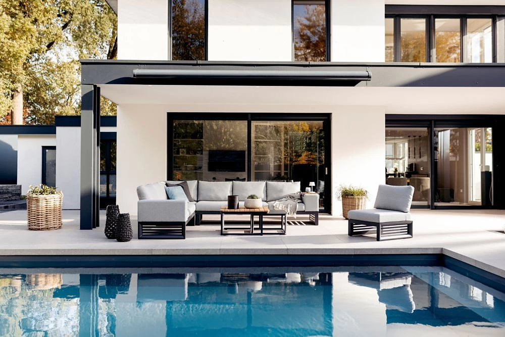 · Loungegruppe MALTA Eckmodul, Sitz- und Rückenkissen Bezug River 766, Gestell Aluminium pulverbeschichtet, Farbton anthrazit, B 80 T 80 H 80 / Sh 40 cm