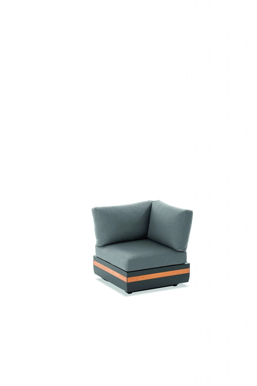 · Loungegruppe VOLANO Eckmodul inkl. Sitz- und Rückenkissen, Bezug Canvas Heather anthrazit, Kufen und Gestell Aluminium pulverbeschichtet, Farbton anthrazit, mit Einlage in Teak natur, 73,5×75 / 80 cm