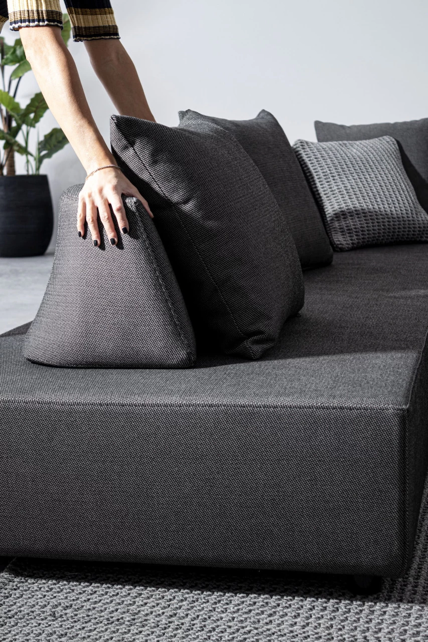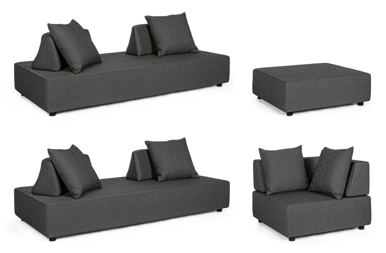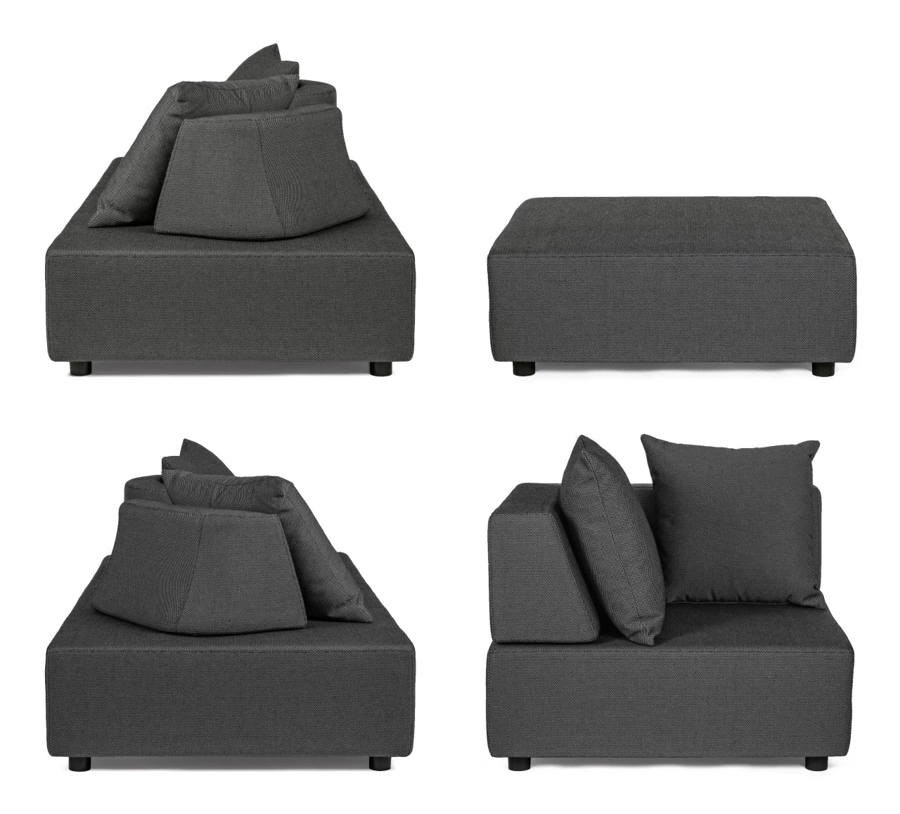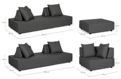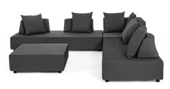 · Vierteiliges Loungeset mit Kissen. 1 Sofa und 1 Chaiselongue. Das Gestell ist aus Aluminium und wurde feuerverzinkt. Hochwertiger Olefin Bezug,Wasserabweisend ( Index 7 ) und mit einem PU Schaum in den Sitzflächen. Rückenkissen extra beschwert für angenehmen Sitzkomfort. Hocker immer dabei.