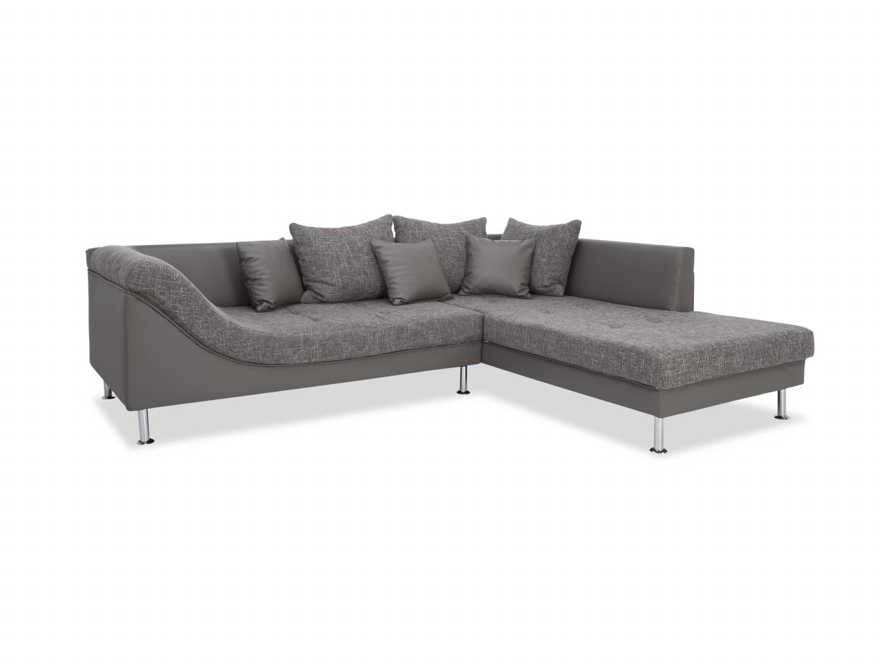 Der Korpus und drei Kissen der Wohnlandschaft sind mit steingrauem Kunstleder bezogen. Der anthrazitfarben gemusterte Webstoff von Sitzfläche und Rückenkissen harmoniert mit diesem und auch mit den Füßen in Metalloptik perfekt.
