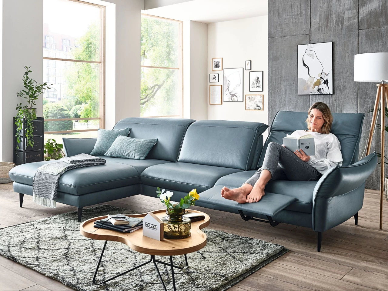 Dessin: echt Leder Vivre(58)Farbe Steel, Fuß: Alu schwarz, Sitzqualität: F2 mittel, Sitzöhe ca. 46 cm, Rücken echt, bestehend aus: Canape gerade Armteil vorstehend links, 3 Sitzer Armteil vorstehend rechts, auf Wunsch: Funktionen und Kissen