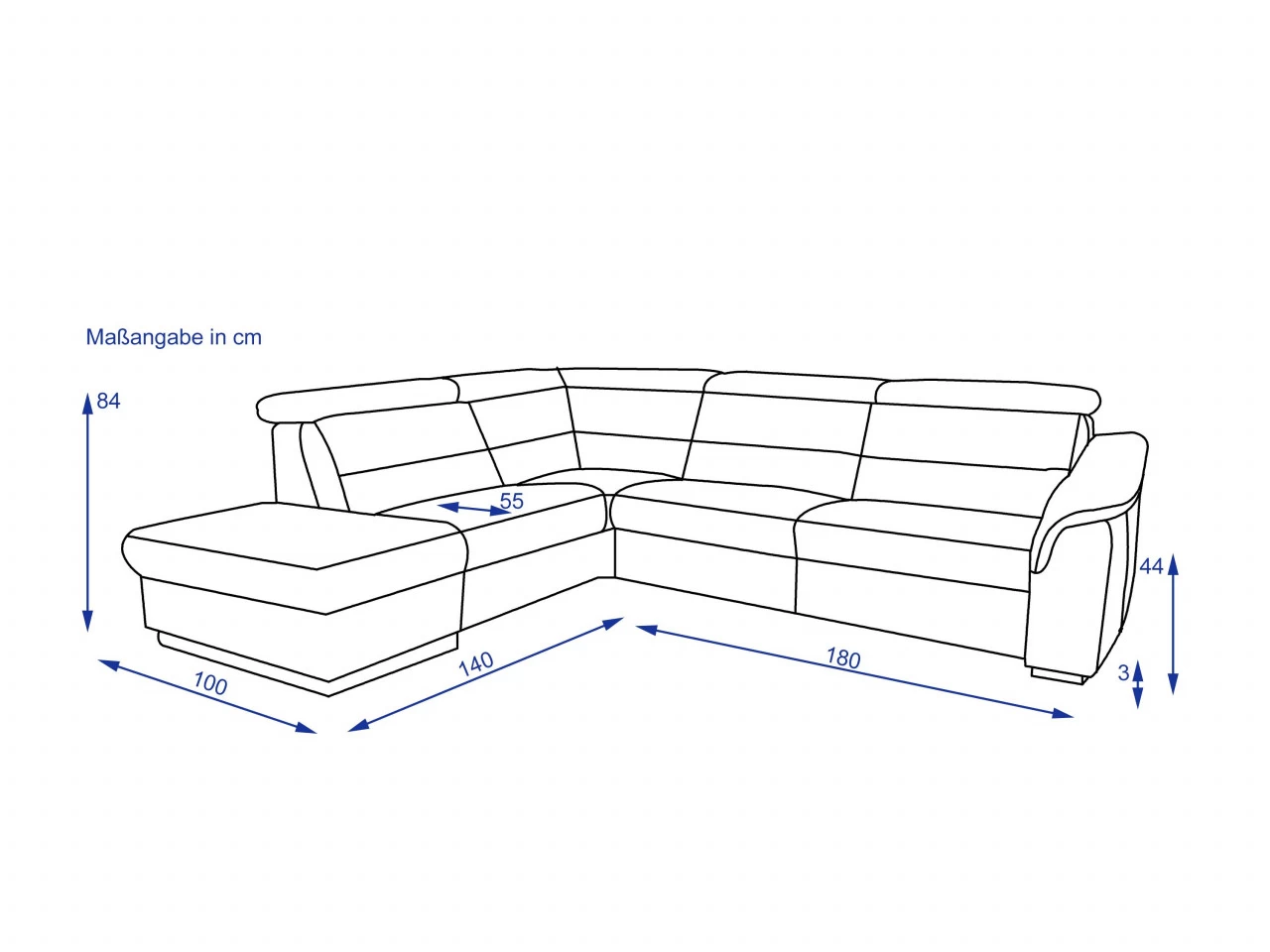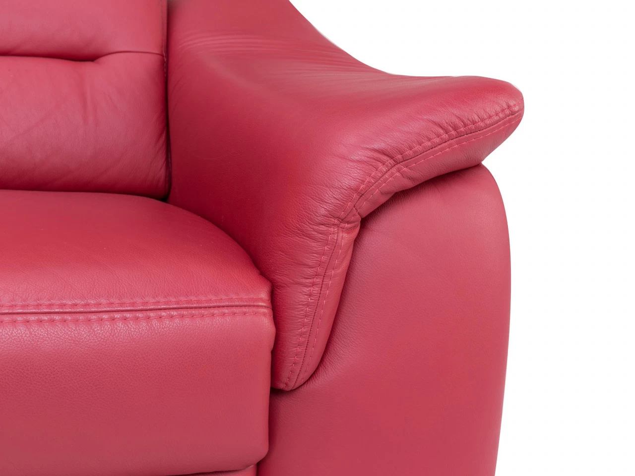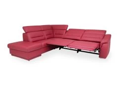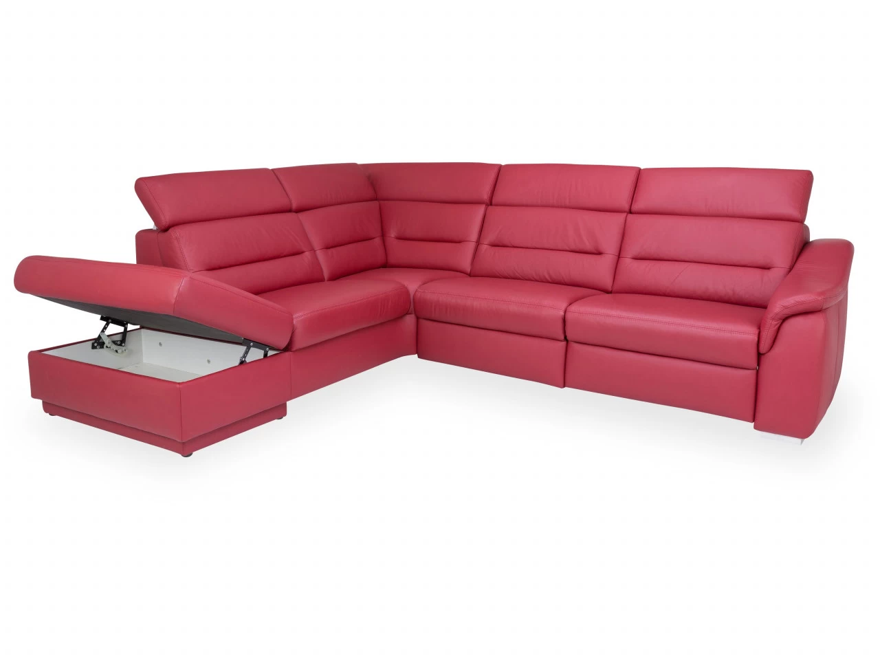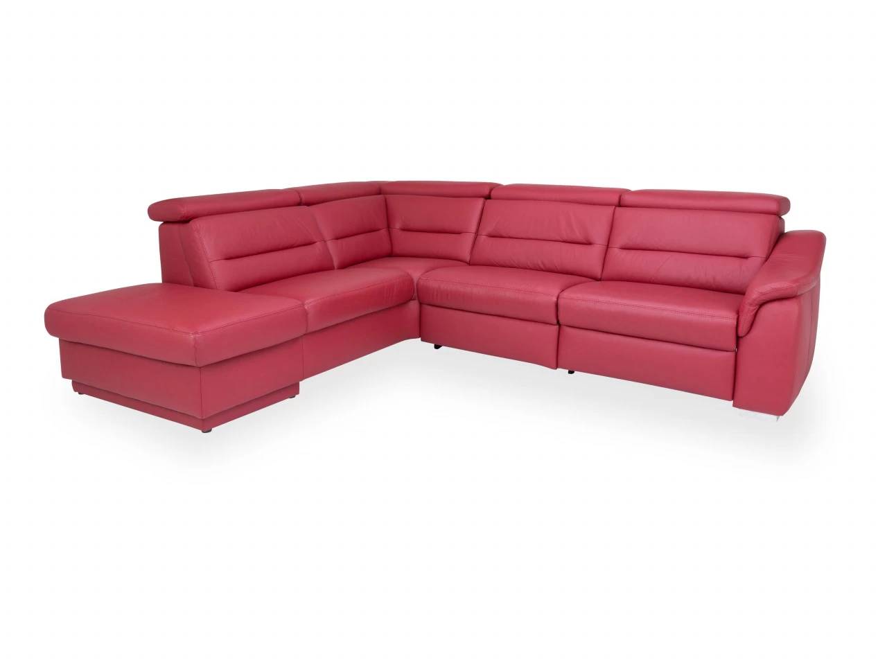 Dessin: Ledergr. Torro rosso (100) Echt Leder bestehend aus: Kombielement 1,5-sitzig m. Anstell- hocker aufklappbar links -1,5KOGFLKV Sofa 3-sitzig AT vorsteh. rechts mit WallAway-Funktion 1-motorisch links + rechts – 3RKV mit Kopfteilverstellung -KV Metallfuß Hochglanz Rücken echt bezogen