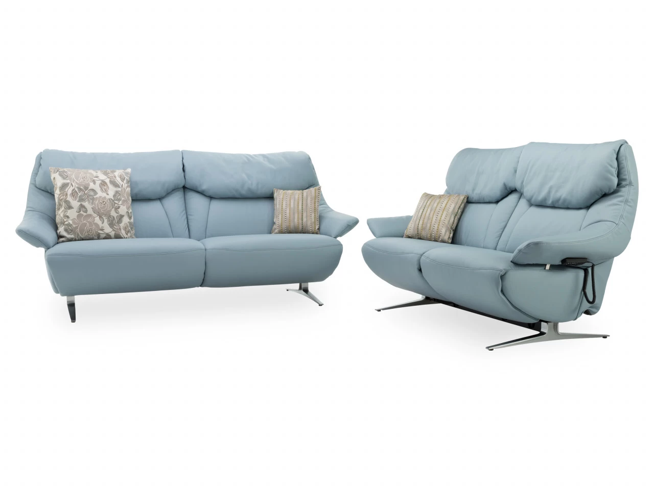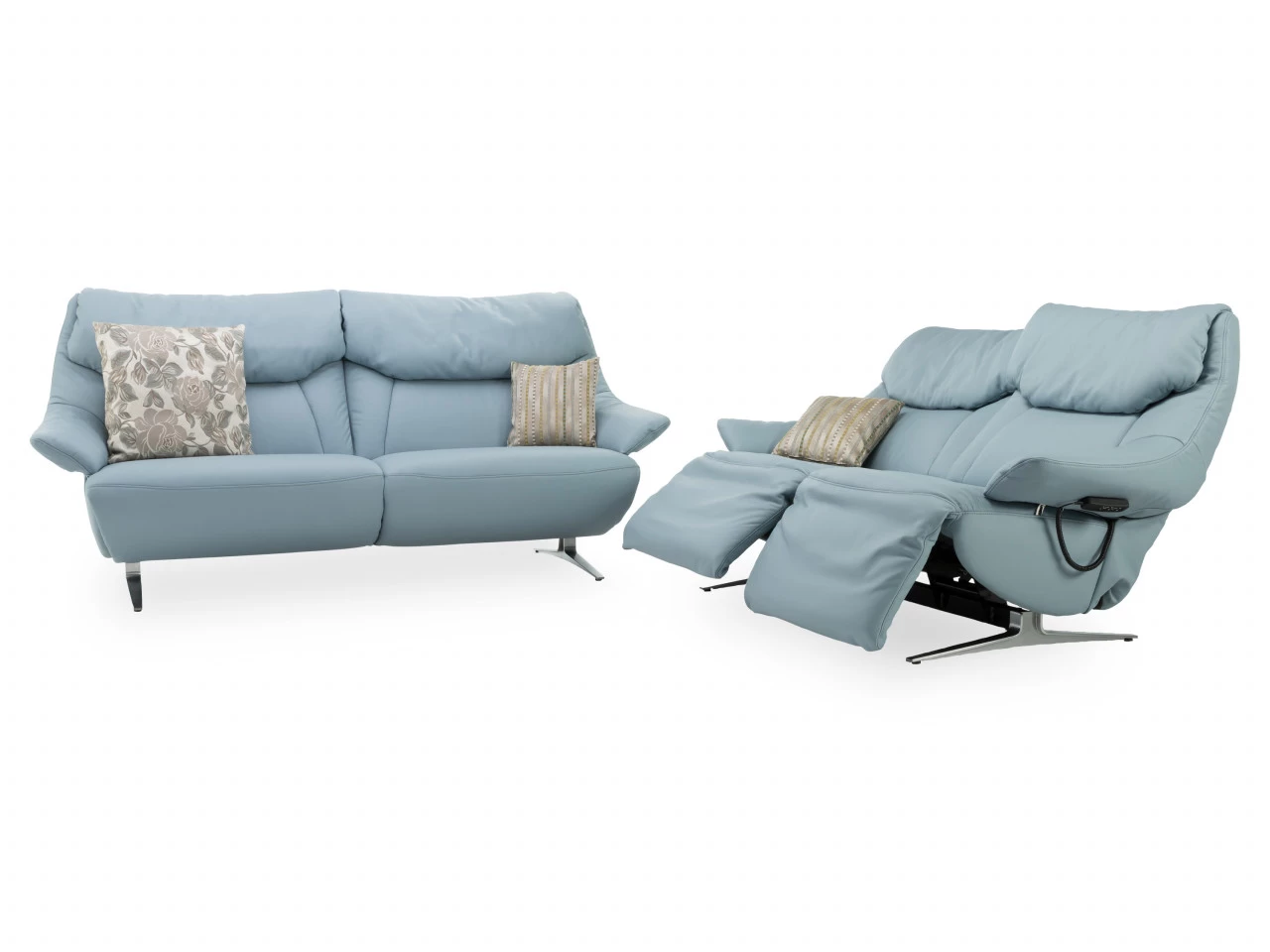 Die Polstergarnitur Mondo Malu wurde mit echtem Leder bezogen. Sie besteht aus einem 3-Sitzer Sofa, einem 2,5-Sitzer Sofa mit elektrischer Sit amp Float Funktion (Akku mit Ladestation). Dazu erhalten Sie 2 Kissen (ca. 40x40cm) und ein Kissen in ca. 52x52cm. Durch die hellblaue Farbe ist die Polstergarnitur ein schönes Element für verschiedene Einrichtungsstile. Der Superlastic Soft Sitz verspricht ein angenehmes und entspannendes Wohlfühlerlebnis. Zudem hat die Polstergarnitur einen festen Stand durch Aluminiumkufen in Edelstahloptik. Der Rücken ist echt bezogen.