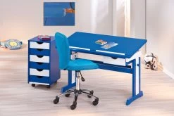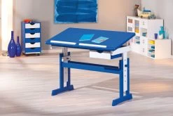 Mit dem Schreibtisch PACO sind der Kreativität am Arbeitsplatz keine Grenzen gesetzt. Die geniale Optik des Schreibtisches kreiert eine gelungene Atmosphäre in Ihrem Arbeitsbereich. Dank seiner Bauart lässt sich das Modell PACO ausgezeichnet in diverse Einrichtungsstile integrieren. Das Büromöbel aus Holz hat die Farbe Blau. Es besitzt eine Breite von insgesamt 109 cm, eine Höhe von 63 cm sowie eine Tiefe von 55 cm. Die vier Wände werden mit diesem Schreibtisch dekorativ und praktisch eingerichtet.
