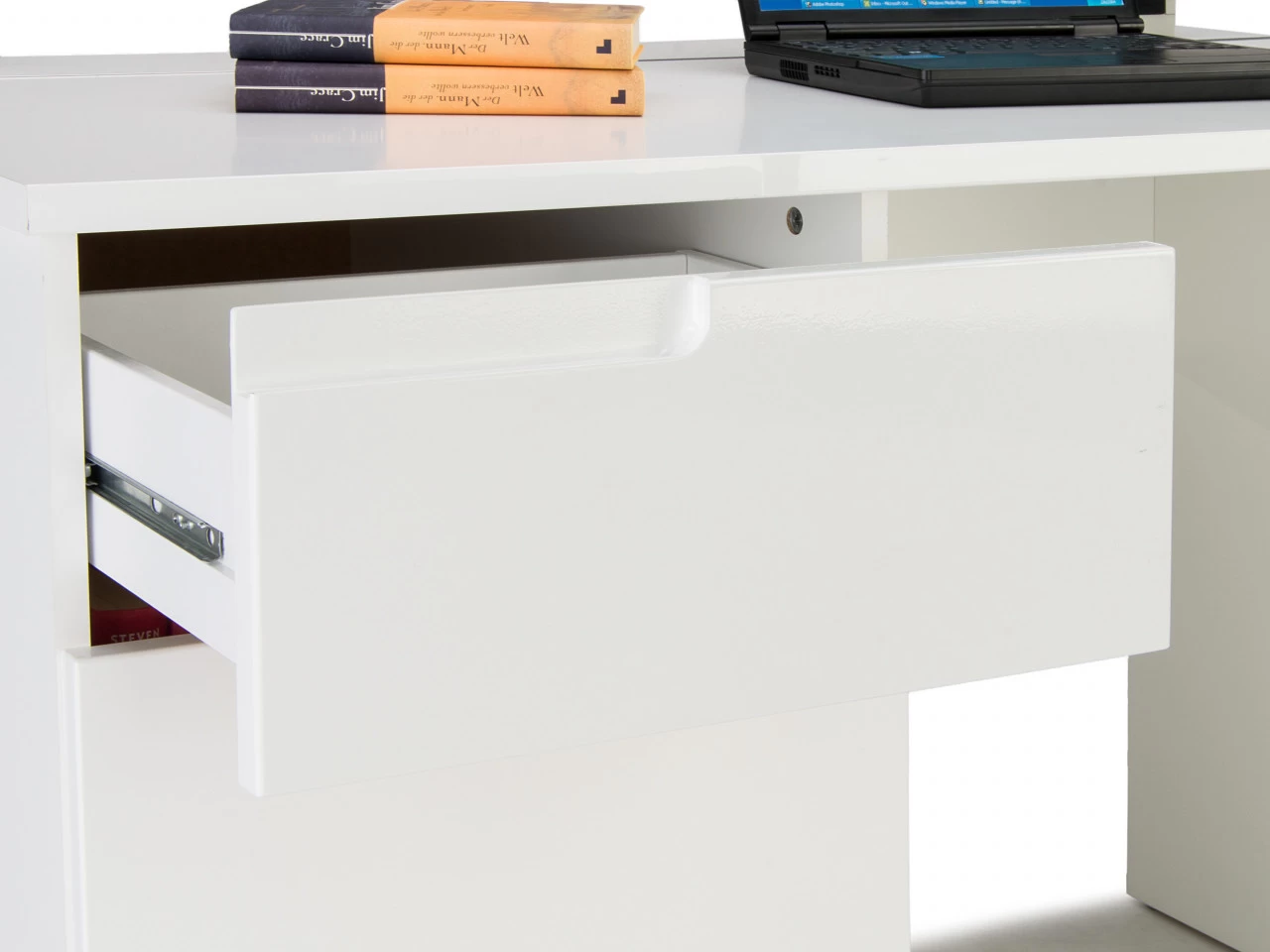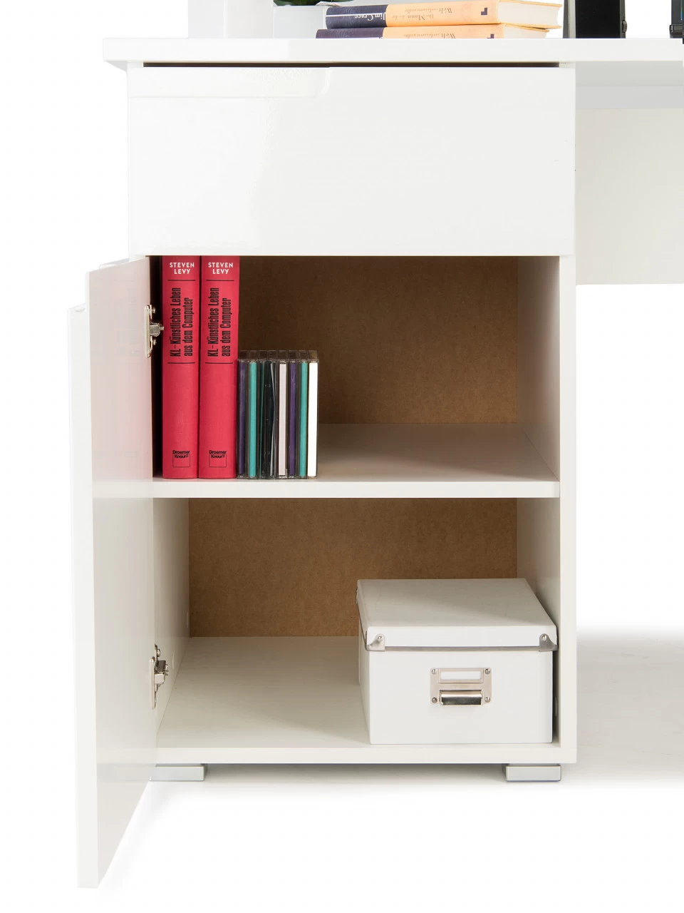 Ein Platz, an dem Du gerne arbeiten wirst: Der Schreibtisch SUNSHINE. Viel Platz um Dich auszubreiten, die Gedanken zu ordnen und zu arbeiten bietet das helle Möbelstück, das sich in diverse Stile integrieren lässt. Der weiße Korpus wird von einer weißen Hochglanzlackfront begleitet und ergibt so eine elegante Kombination. Hinter einer Tür und einer Schublade bietet der Schreibtisch Stauraum für wichtige Utensilien. Praktische Griffe erleichtern dabei das Öffnen und Schließen.