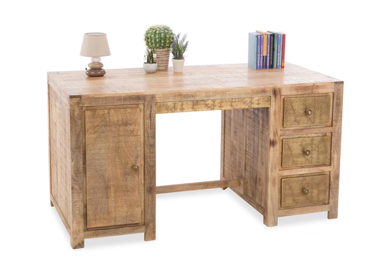 Landhausstil pur – der Schreibtisch Utah überzeugt mit tollem Design und viel Stauraum. Da der Tisch aus gebürstetem Mango-Holz massiv besteht, handelt es sich hier um beste Qualität und hohe Stabilität. Links steht Ihnen ein großes Fach zur Verfügung, dass Sie zum Beispiel für Ihren Computer nutzen können. Auf der rechten Seite befinden sich drei Messingschubladen, in denen Sie Ihre Gegenstände bestens verstauen können. Neben den verschiedenen Staumöglichkeiten besitzt dieser Tisch eine großzügige Arbeitsplatte, auf der Sie Ihre Arbeit ganz entspannt erledigen können. Dieser Schreibtisch vereint Design mit Nützlichkeit und ist für Ihr Arbeitszimmer im Landhausstil perfekt geeignet!