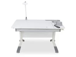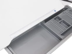 1407241 Schreibtisch Kreideweiß, Gestell weiß feststehende L-förmige Platte rechts,für Rechtshänder empfohl. 1408011 Schubkastenauszug Metall, silberfarbig mit Selbsteinzug und Dämpfung, silber- farbige Griffblende, Utensilienschale mit Ausformung für Schreibzubehör und Notebook, max. Belastbarkeit 30 kg 1408631 Rollcontainer 3S, kreideweiß oben ein Auszug mit Utensilienschale in der Mitte und unten ein Schubkasten jeweils mit Selbsteinzug und Dämpfung 1404168 Sitzpolster für Container Bezug Azurblau, TKZ 100% Poly- ester 1468171 Schreibtischlampe PARA.MI weiß lackiert Anzahl Sockel/Fassung.: 1 Sockel/Fassung……..: FEST Energieeffizienzklasse: A
