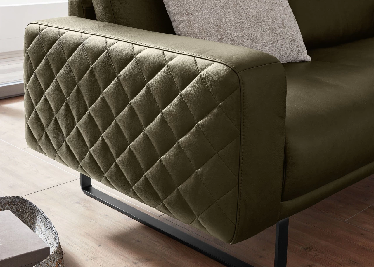 · Sofa 3-sitzig Bezug Leder Mercury oliv, Rücken echt. Fuß Kufen schwarz matt. Inklusive 1 Kopfstütze. Sitzunterfederung mit dauerlastischen Stahl-Wellenfedern. Exklusive Dekokissen.