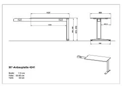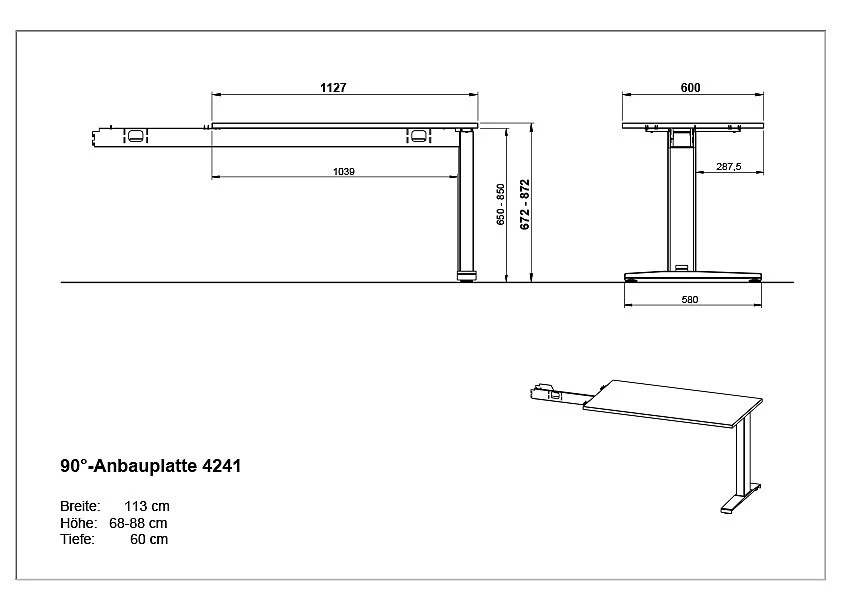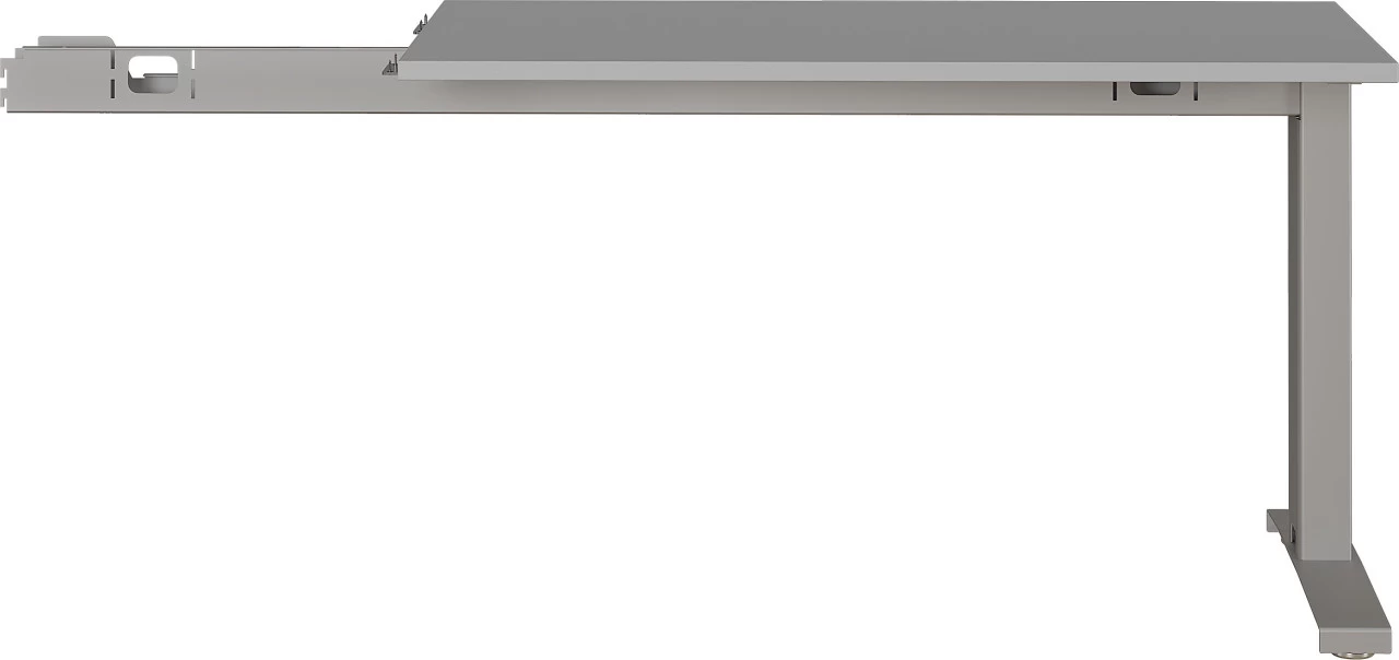 · Mechanisch höheneinstellbare 90-Grad-Anbauplatte mit einem C-Fuß, Tischplatte (belastbar bis zu 80 kg) in der Farbe Lichtgrau, Gestell aus pulverbeschichtetem Metall in Silber, Höhe einstellbar von 68-88 cm, Melaminharzbeschichtung, ABS-Kanten, Made in Germany.